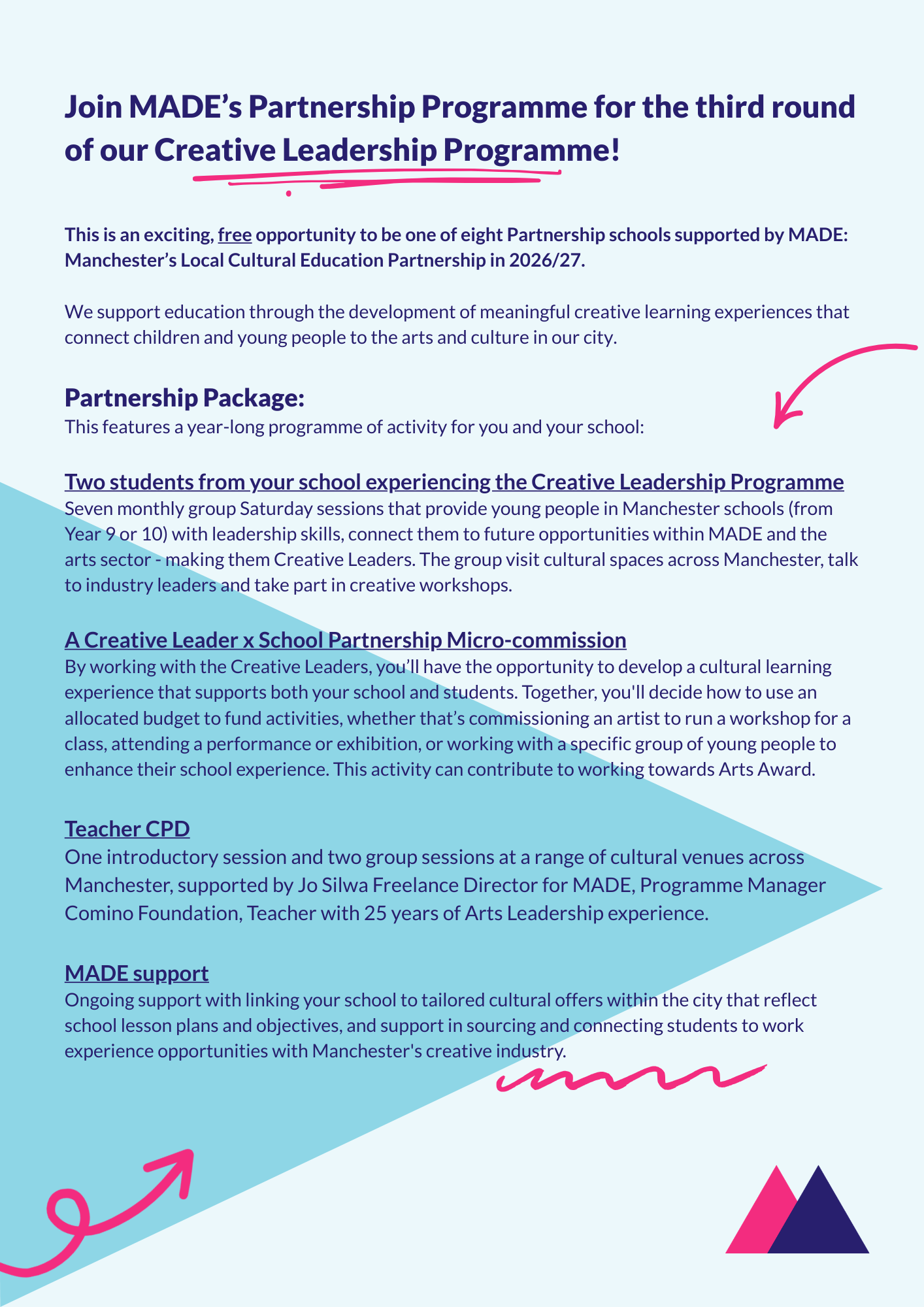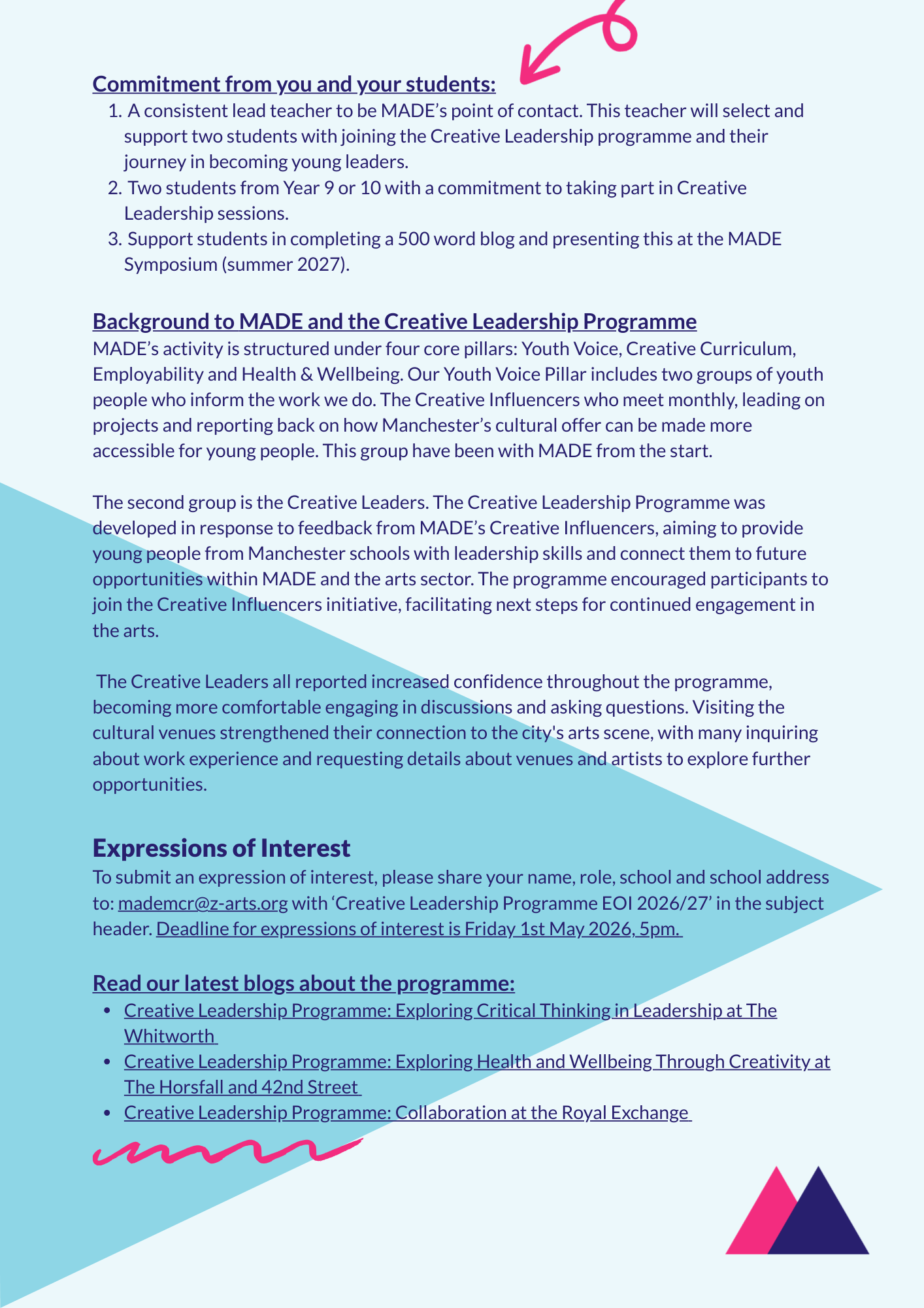 To submit an expression of interest: Please share your name, role, school and school address to: mademcr@z-arts.org with 'Creative Leadership Programme EOI 2026/27' in the subject header.